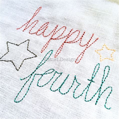 Happy Fourth Redwork Machine Embroidery Design Pattern Download Designs 4X4 5X7 6X10 8X12 Modern Cursive 4th Of July Colorwork